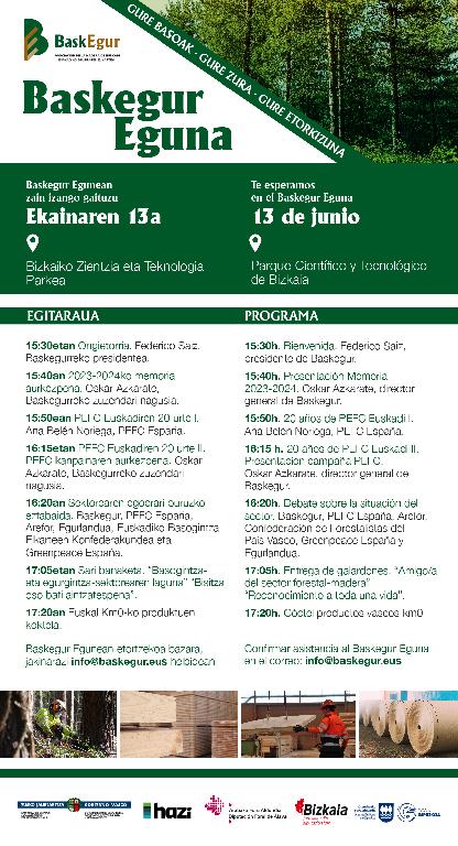 Este jueves, 13 de junio, se celebra en el Parque Científico y Tecnológico de Bizkaia, Baskegur Eguna. Organizado por la Asociación de la Madera de Euskadi, Baskegur, tiene como lema "Gure basoak, gure zura, gure etorkizuna".