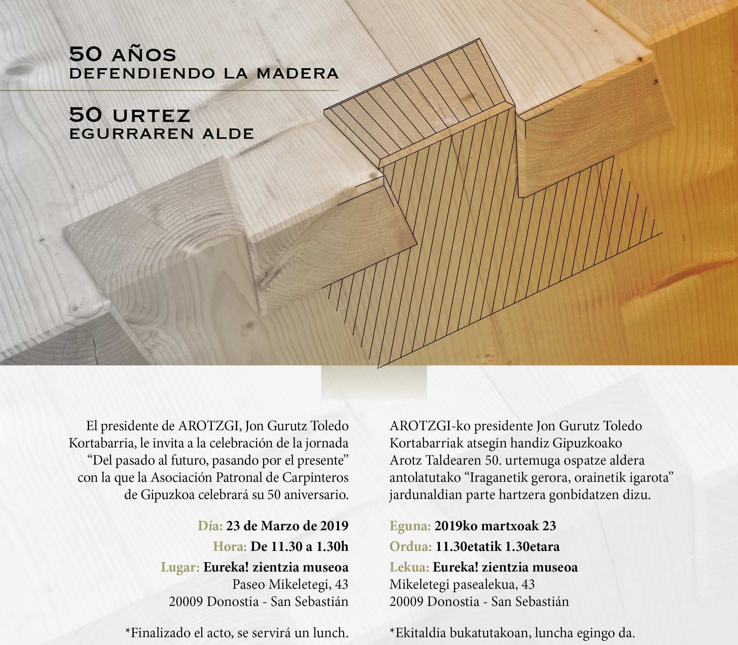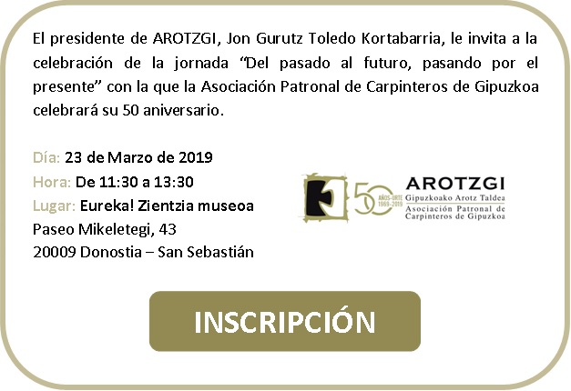 El presidente de AROTZGI, Jon Gurutz Toledo Kortabarria, le invita a la celebración de la jornada “Del pasado al futuro, pasando por el presente†con la que la Asociación Patronal de Carpinteros de Gipuzkoa celebrará su 50 aniversario.