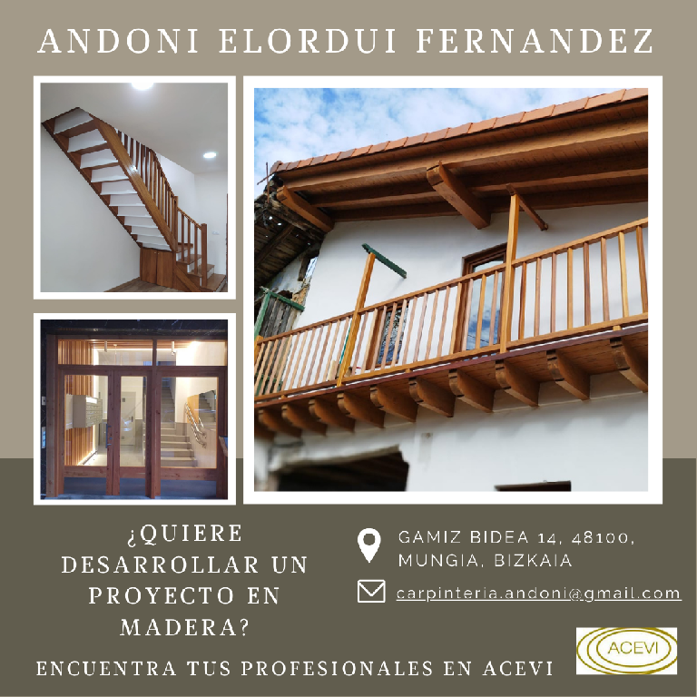 ANDONI ELORDUI FERNÁNDEZ esperientzia handiko enpresa da eraikuntzaren eta eraberritzearen sektorean, eta arotzerian aritzen da, bai barruan, bai kanpoan. Zurezko lanak egiten dituzte, hala nola eskailerak, itxiturak, balkoiak...